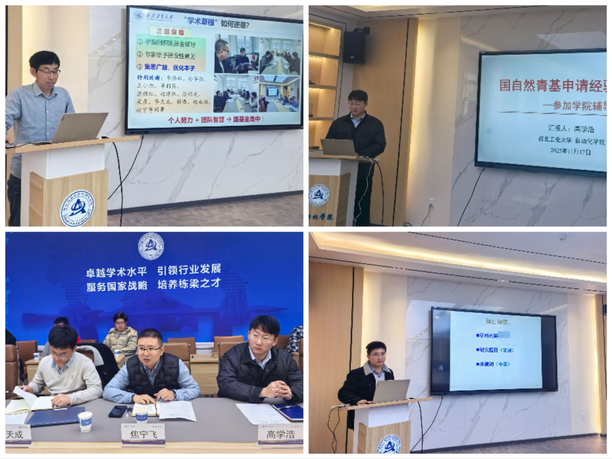 在经验交流环节,2025年获批项目教师代表李天成、焦宁飞、冯斌和高学浩结合自身经验,围绕申报书撰写技巧与项目申报经验展开分享。李天成依托其主持青B项目、面上项目及叶企孙联合基金重点项目的复合经验,系统分析了多类型项目申报书的结构性差异与共性规范,重点阐释了从选题创新性到技术路线的逻辑闭环构建策略。焦宁飞结合个人两次获批面上项目经验,通过申报者与评审专家的双重视角对比,提炼出申报书撰写避坑指南。冯斌深度复盘其面上项目多次申报历程,以个人申报书各模块的实证,展示如何运用多轮同行评议提升申报书质量,特别分享了通过广泛听取各类同行修改建议,多次打磨申报书获取的宝贵经验。高学浩特别致谢学院的全周期培育管理机制,通过解剖优秀申报书案例库,构建“问题凝练-方法创新-基础验证”的写作框架,并分享其在2025年度青C申报中参与学院精细辅导实现申报书质量跃升的典型经验。