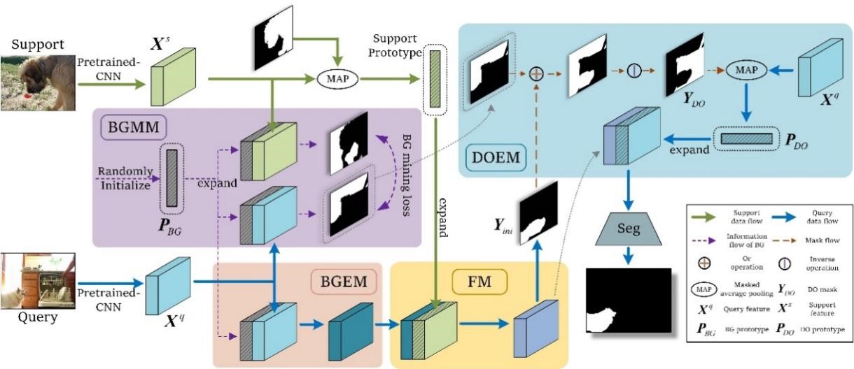 现有小样本语义分割研究仅侧重于有效地挖掘目标物体的信息。然而,对于背景和干扰物体等非目标区域中的模糊区域,目前的方法往往难以分辨。为此,本文提出在仅使用已知的目标物体标签的前提下,通过背景损失函数来指导类别无关的背景原型学习,从而实现对背景的挖掘排除。然后,我们进一步找到与当前查询图像相关的干扰物体信息并排除。此外,我们提出了一种原型对比学习算法,以提高模型区分目标对象与干扰物体的能力。