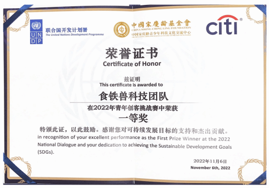 “食铁兽科技团队”从世界各地100多支队伍中脱颖而出,斩获第五届”青年创客挑战赛”决赛一等奖。该赛事由联合国开发计划署(UNDP)、中国宋庆龄青少年科技文化交流中心、花旗银行(中国)有限公司共同主办。