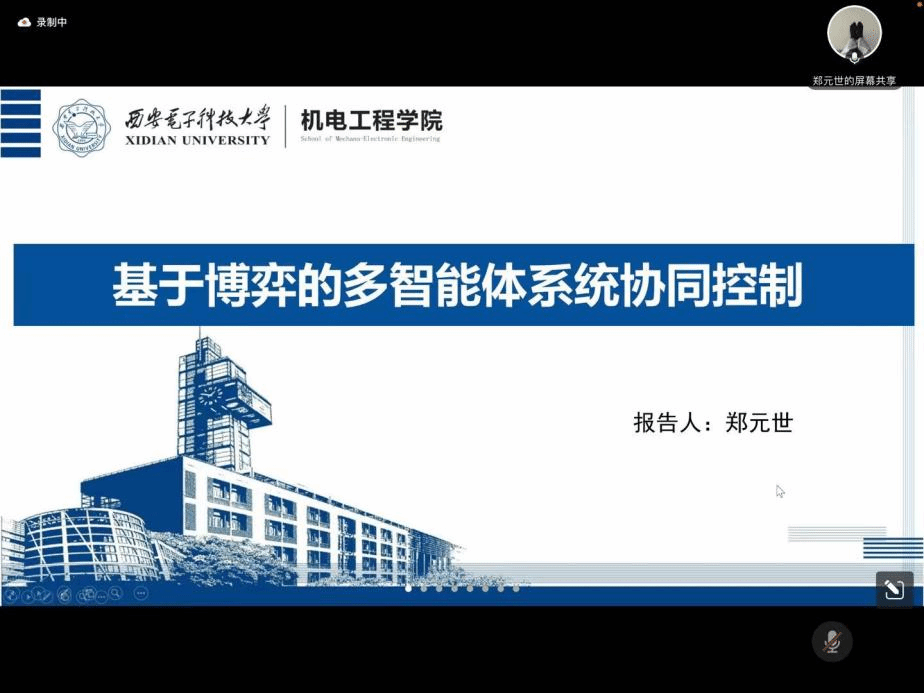 的李慧平教授做了题为“海洋航行器模型预测控制”的学术报告,西安电子科技大学的郑元世教授做了题为“基于博弈的多智能体系统协同控制”的学术报告,国网青海省电力公司清洁能源发展研究院新能源产业发展研究中心的杨立滨副主任做了题为“基于电池储能的新能源送端电网暂态能量控制及储能优化方法研究”的学术报告,西安交通大学的张萌副教授做了题为“基于多智能体深度确定性策略梯度的非线性电力系统频率控制”的学术报告,国网陕西省电力有限公司电力科学研究院电源技术中心的王若谷副主任做了题为“含高比例新能源的电力系统优化运行与控制技术研究”的学术报告,新疆大学的于志永副教授做了题为“几类多智能体系统一致性及分布式优化控制方法”的学术报告。