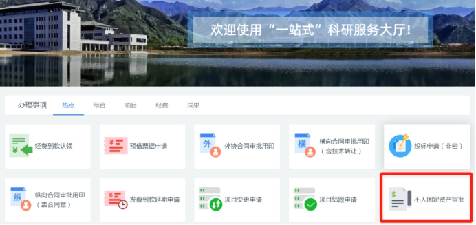 2. 办理地址:登录翱翔门户,点击“科研系统”进入系统主页;在主页办理事项栏选择“不入固定资产审批”。