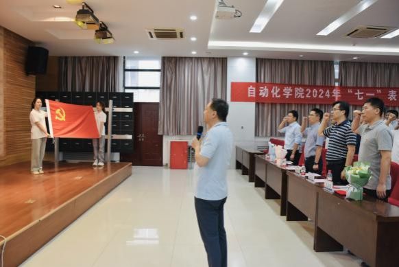 在潘泉教授的带领下,全体党员起立,面向党旗,一同重温入党誓词。