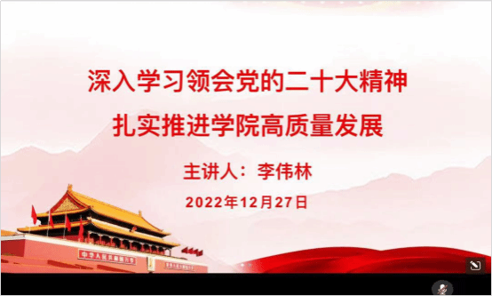 李伟林以“深入学习领会党的二十大精神,扎实推进学院高质量发展”为主题,详细阐述了党的二十大精神的丰富内涵和重大意义,并结合学院工作十年的发展变化,就办学规模、人才培养、科学研究等六个部分的发展变化进行了对比分析。同时,他对《中共中央关于认真学习宣传贯彻党的二十大精神的决定》和校院两级关于学习宣传贯彻党的二十大精神的实施方案进行了传达学习,对学院已开展活动的相关情况和下一步工作思路作了简要介绍。最后,李伟林还围绕党纪党规和学院党风廉政工作,为与会人员作了廉洁教育。