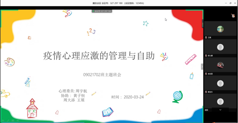 2017级通过线上视频会议、观看心理教育视频、QQ群讨论等多种方式,积极开展心理主题班会。小班心理委员讲解了疫情期间居家不出门面临的常见心理困惑。同学们分享和讨论了自己的心理状态及应对疫情的方法,面对当前有困惑的同学,大家积极出谋划策,为其排忧解难。会后,同学们纷纷表示,此次班会为大家提供了一个很好的沟通交流的平台,了解了心理健康知识,有效缓解了疫情期间居家无法出门导致的焦虑情绪。