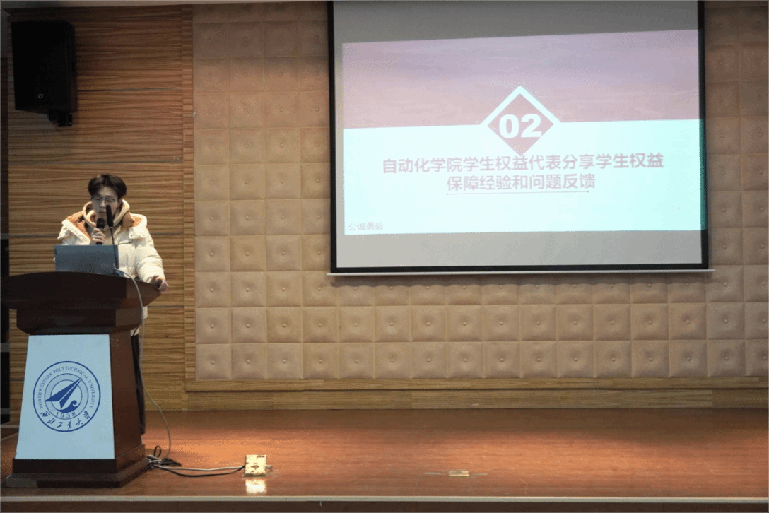 学生会的权益负责人刘松岩进行权益工作汇报总结。他详细列举了过去一年所取得的权益工作成果,介绍了学院学生会权益反馈体系和反馈流程的优化内容,如开通线上线下双渠道,让权益反馈更便捷、更迅速、更有效。他还提出了未来权益工作的四“化”新标准:权益机制体制化、权益提案渠道平台化、权益知识普及生活化、权益服务成果可视化。