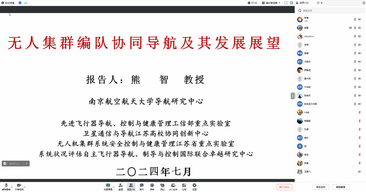 交流期间,熊智教授作题为“无人集群编队协同导航及其发展展望”的讲座,通过结合理论与应用,图文并茂地介绍了无人集群协同及协同过程中的导航技术。他针对无人集群编队协同导航的研究难点归类出三个技术挑战:分别是大规模无人集群海量信息对协同导航信息处理方法带来新的挑战、跨域异类异构无人集群对协同导航架构带来重大挑战、卫星拒止下如何实现集群协同导航是集群成功应用的重大挑战,并针对上述挑战介绍了相应的解决策略。报告过程中,熊教授展示了空空协同、空地协同等多种集群编队协同应用案例,并分享了一些非常实用的研究经验。最后,他总结了在无人集群编队协同导航未来可能的研究方向。