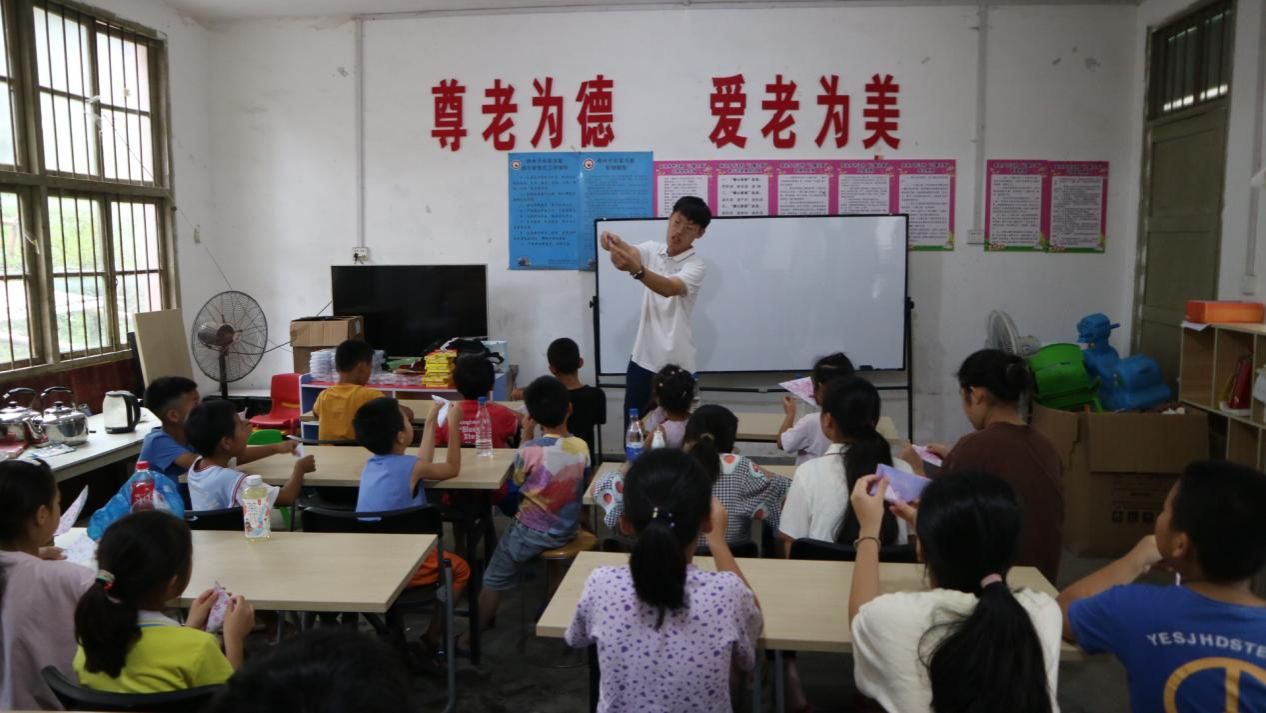 来到融水县安太乡江竹村儿童之家,队员们精心做好各项准备,期待着孩子们的到来。首先,实践队员陈睿博为孩子们带来了一堂航空科普课程《空中武士--战斗机》。在介绍多种类型战斗机的同时,陈睿博也注重类别身边的物件,帮助孩子们更直观地理解复杂的航空原理。例如,他用水枪的水流喷射风扇扇叶来形象地介绍了机关枪与螺旋桨的工作原理;通过开关教室的门,引导孩子们感受风的流向,从而体会飞机的鸭翼布局对于提升飞行稳定性的作用。陈睿博采取既生动有趣,又寓教于乐的教学方式,极大地激发了孩子们对航空知识的兴趣与好奇心。