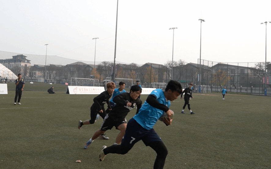 橄榄球代表队对阵中国农业大学的幺幺玖-兽刃联队。队员们稳扎稳打,在防守上寸步不让,步步紧逼,不断向对方进攻队员施压。比赛进行到一半时,李左与梁代福巧妙配合接球突破,顺利拿下一分。这场比赛最终以1:1战平,杰克论坛