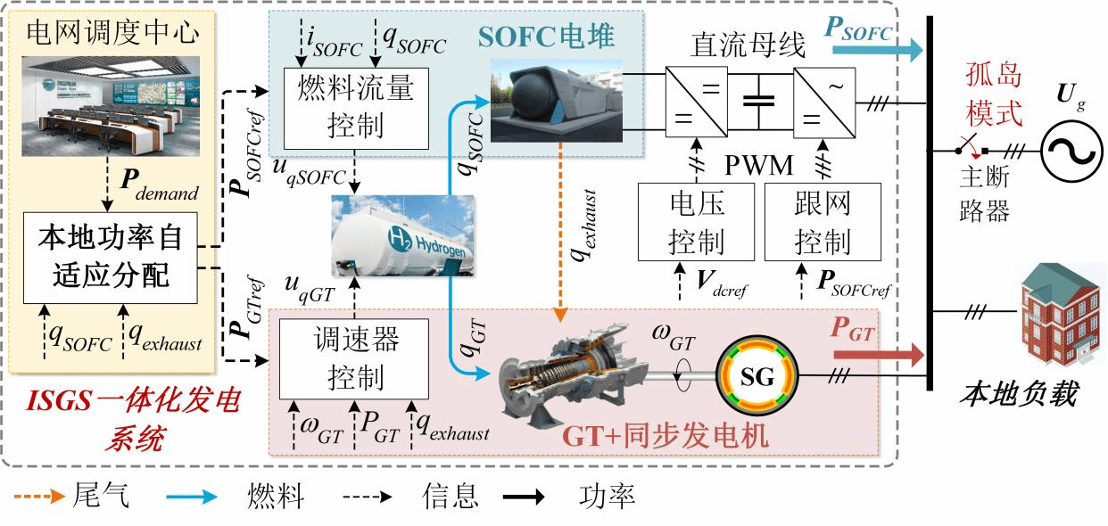 六、论文简介:本文提出一种面向微电网应用的固体氧化物燃料电池-燃气轮机( SOFC-GT )系统一体化发电 建模及协同控制方法。 首先,构建了系统一体化发电动态模型,通过引入GT对于SOFC尾气燃料二次利用过程的动态描述,将原本独立的SOFC和GT基础发电模型耦合形成一体;其次,设计了考虑尾气燃料耦合下面向SOFC与GT各独立发电单元的一次控制算法,以保证此两部分各自的基础运行;最后,从系统顶层功率分配角度出发,设 计在线自适应功率分配算法以完成系统内部SOFC/GT发电单元的协同运行,在保证了各单元安全运行的前提下实现系统的快速、高效一体化发电;该协同控制方法同时赋予了该一体化发电系统 跟网 与 构网能力 ,对于提升微电网弹性及灵活性、促进富氢燃料的充分高效利用并降低碳排放都具有十分重要的现实意义。