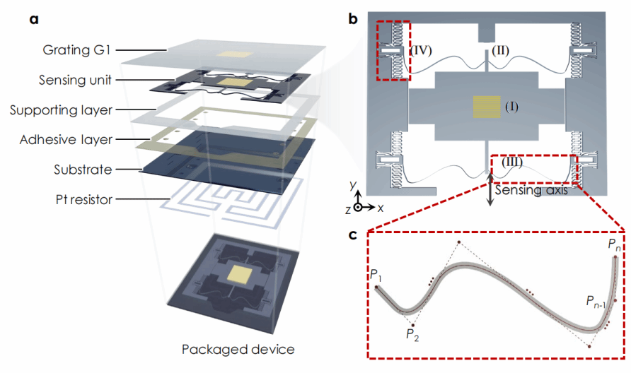 五、论文简介:地球物理应用和分布式重力探测等新场景的不断涌现对小型化高精度重力加速度测量提出了愈发迫切的需求。近期我们利用计算智能驱动的自由几何建模与多级设计,构建了自由几何反弹簧柔顺机构(F-AS),实现了片上结构中世界领先的固有频率(~1 Hz)和加速度-位移灵敏度(~100 μm/Gal),同时结合拥有pm位移测量精度的高集成度微光栅腔式位移测量单元,实现了μGal/ng级的重力加速度测量灵敏度和出色的测量稳定性。这种基于可修调自由几何非稳态柔顺机构的多级设计方法也为解决实现复杂结构极致性能的设计问题提供了解决思路。