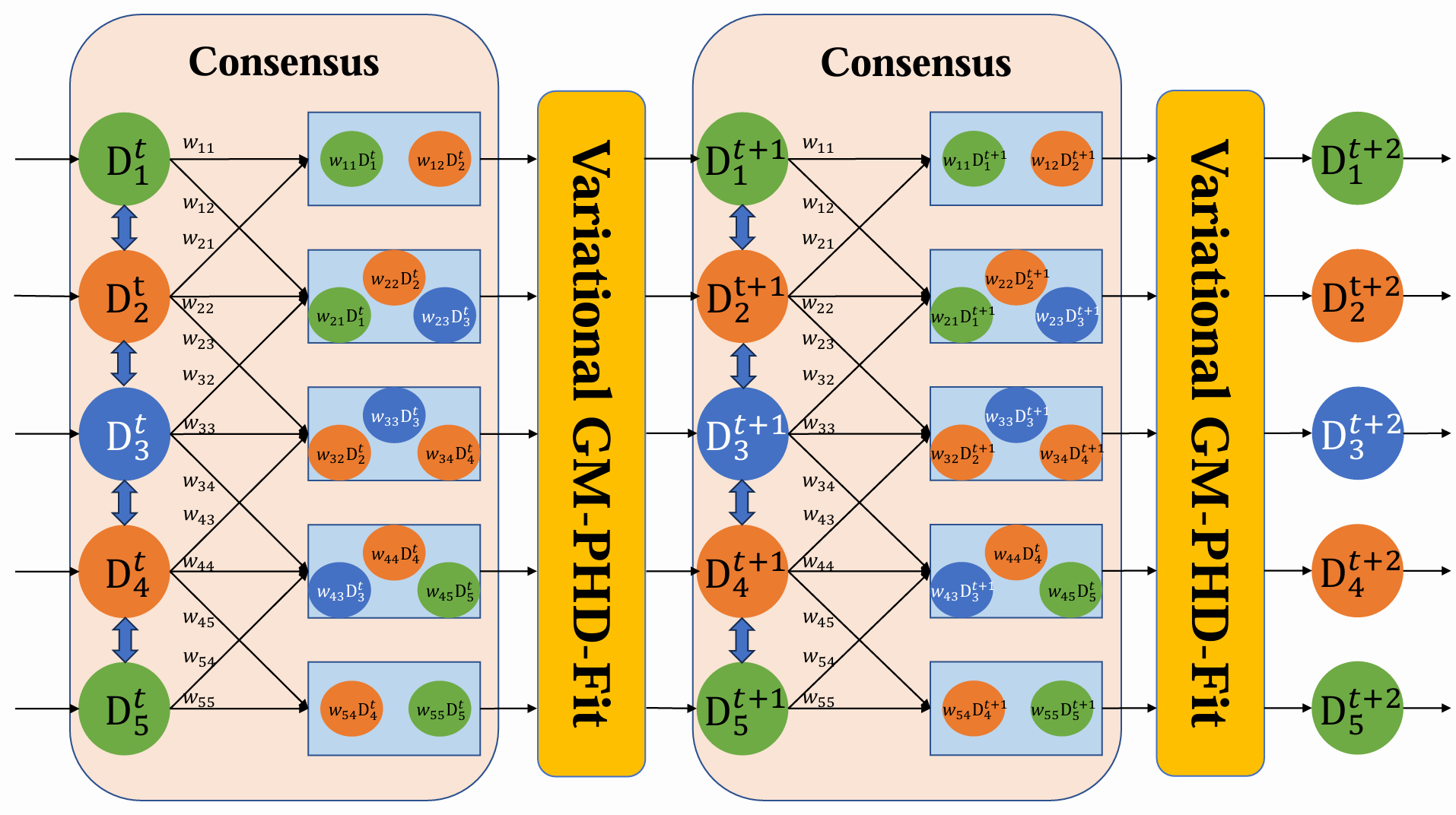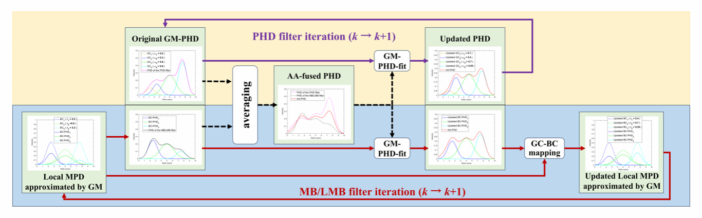 针对此问题,本论文考虑了三种最常见的RFS滤波器的分布式融合场景,分别为高斯混合概率假设密度滤波器(GM-PHD filter)、多伯努利滤波器(MB filter)以及标签多伯努利滤波器(LMB filter)。在本论文的前序部分《Arithmetic Average Density Fusion- Part II: Unified Derivation for Unlabeled and Labeled RFS Fusion》中作者已证明,所有RFS滤波器之间多目标概率密度(MPD)的算术均值(AA)融合其本质均为概率假设密度(PHD)融合,而PHD融合可以获得对任意区域内目标数量的一致性估计。在本论文中,三种RFS滤波器的异构MPD均被转换为PHD并进行AA融合。随后,为保证各个滤波器的闭合性,需要通过最小化KL散度来将融合后PHD中的信息反馈至本地滤波器的MPD中,而两者均为高斯混合分布的形式,KL散度不存在解析解。为此,作者采用了变分近似方法推导出KL散度的变分上界,通过最小化变分上界实现了由PHD至MPD的信息反馈,最终得到两种优化方法:variational GC-weight-fit 与variational GM-PHD-fit。前者仅优化本地MPD中高斯组件的权重,计算量较小。后者优化本地MPD的所有参数,因而精度更高。实验表明本文所提方法大幅提升了三种滤波器的跟踪精度,首次实现了异构RFS滤波器的分布式协同,填补了这一领域的空白。此研究的亮点工作在于摆脱了在MPD层面寻求融合方法的定式思维,转而在PHD公共空间进行AA融合并将信息反馈回异构MPD中,为概率密度融合领域打开了新思路。