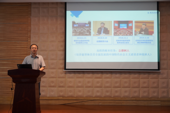 首先潘泉书记传达了汪校长在暑假学习研讨会暨新学期干部大会上的讲话精神,强调了此次研讨的三点重要内容,包括思政课程改革创新与课程思政建设,一流专业建设以及一流课程建设,并要求大家要认真深入研讨,形成“门门课程有思政,门门课程奔一流”的局面和成效。