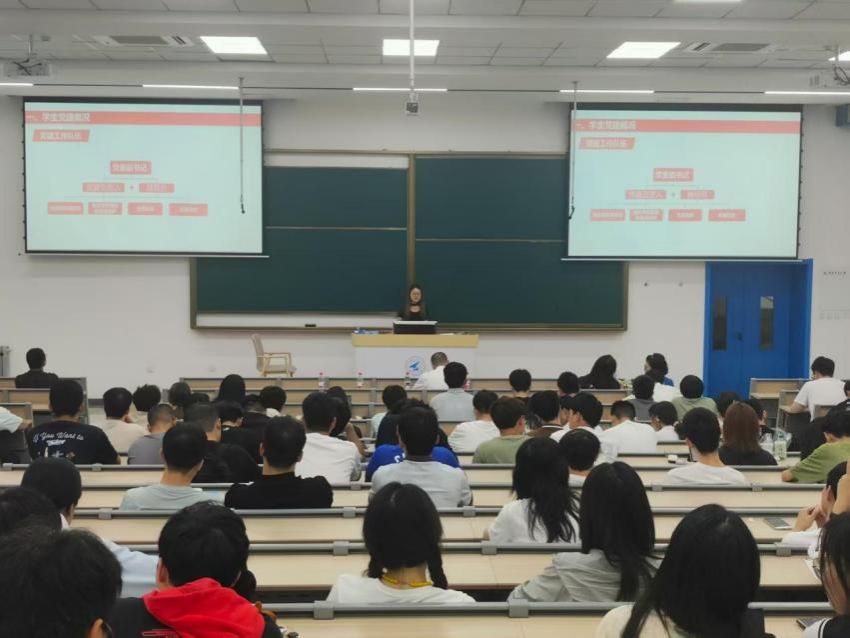 李晨静介绍了学院党建基本情况,并着重强调了党员发展流程、培养教育体系、党员材料书写规范及党组织关系转接等事项。她明确了各阶段的时间节点与核心要点,同时提醒同学们要以严肃认真的态度对待入党过程,自觉向党组织靠拢,以实际行动践行入党初心。
