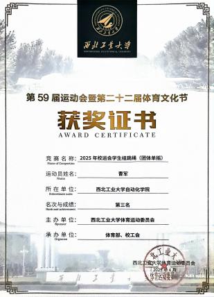 作为自动化院足球队的主力队员,他凭借出色的球技和顽强的精神,跟随院队征战各级赛事,获得“三航杯”季军等5项奖项。除了足球,其他体育项目也有他矫健的身影。“三航杯”广播体操比赛获第七名,校运动会“团体单摇”项目获团体第三名,用实力赢得“体育先进个人”荣誉称号,展现出“文武兼备”的青春风采。
