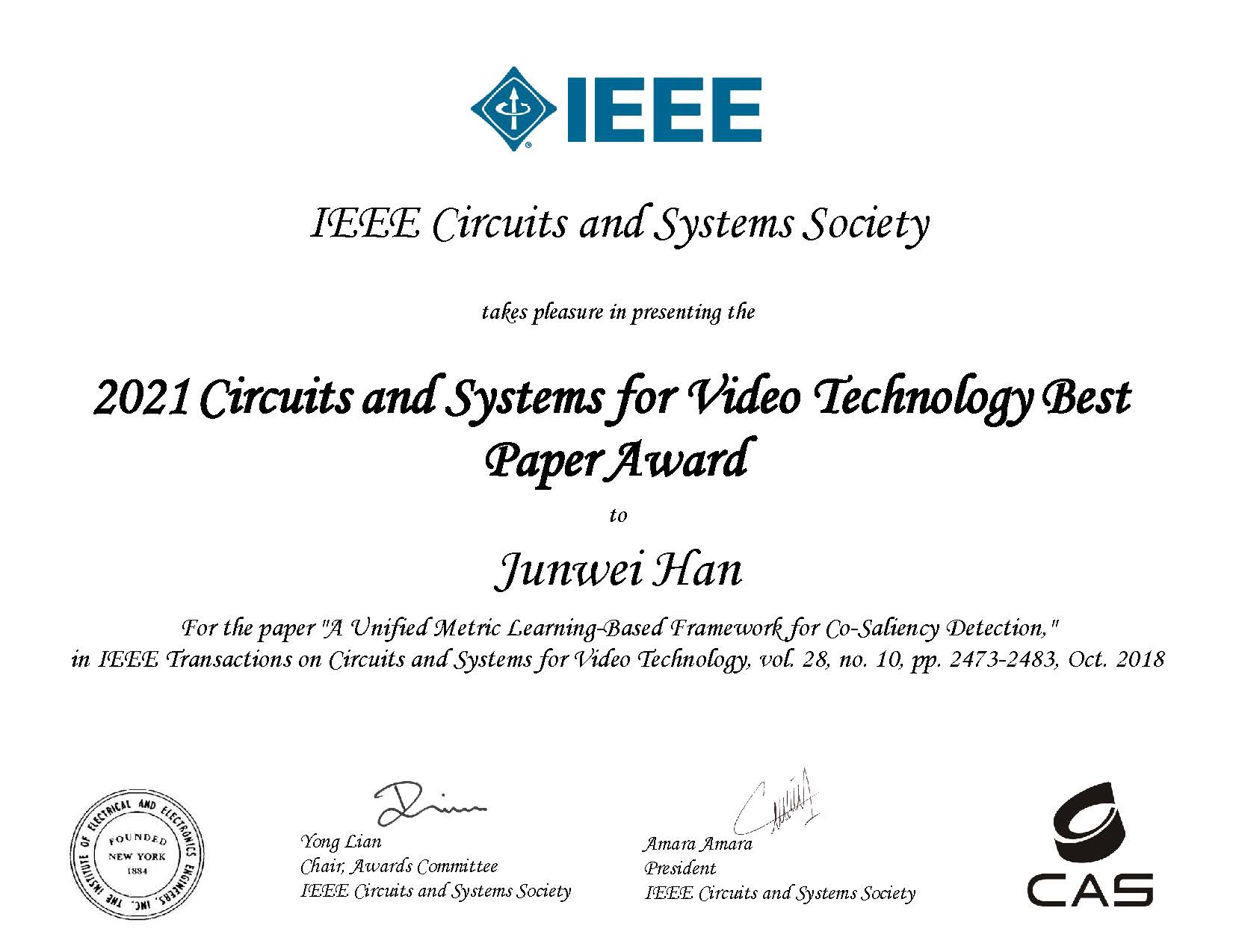 脑与人工智能研究团队韩军伟、程塨教授等合著的论文“A unified metric learning-based framework for co-saliency detection”获得多媒体领域顶级国际期刊《IEEE电路系统视频技术汇刊》(IEEE Transactions on Circuits and Systems for Video Technology, TCSVT)2021年度最佳论文奖(Best Paper Award)。