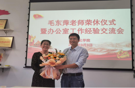 仪式由办公室主任魏爱玉老师主持。首先,王小旭副院长、刘准钆副院长、许斌副院长分别为毛老师颁发奖杯、赠送鲜花、赠送纪念品。