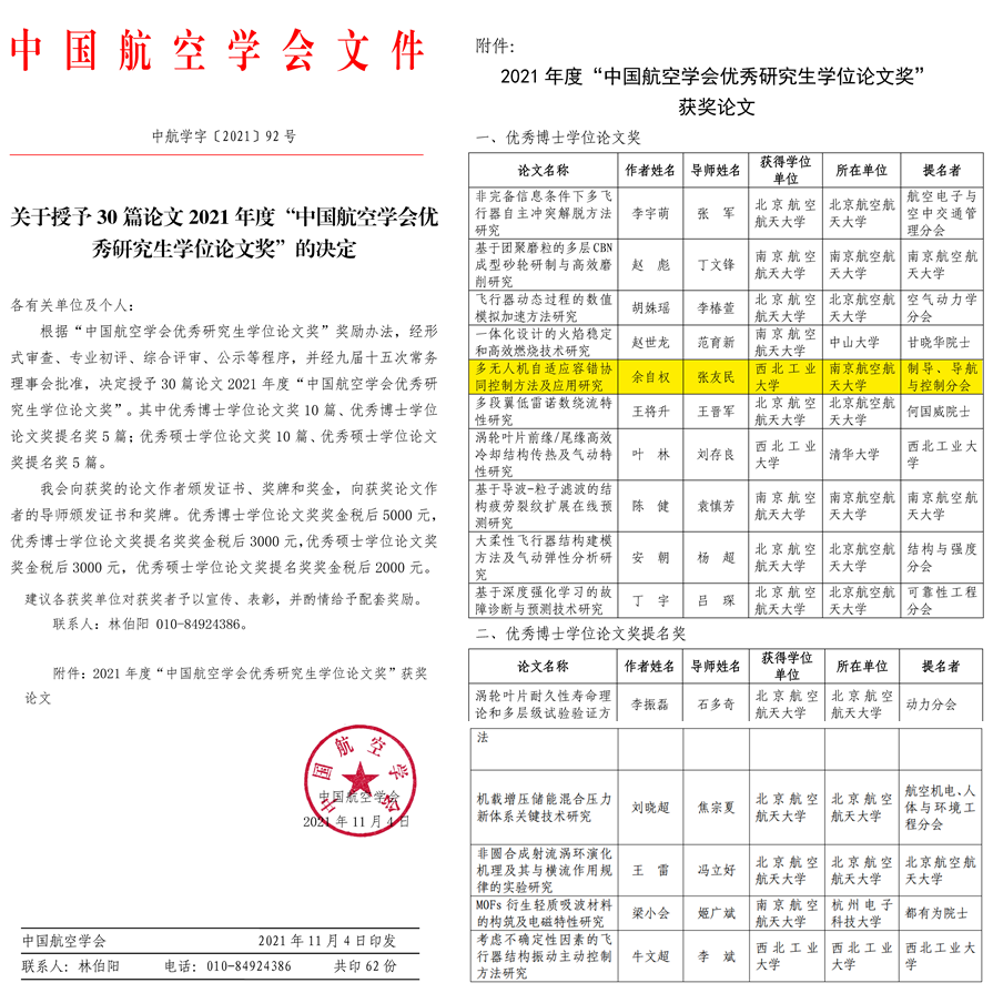 博士毕业生余自权(导师:张友民教授)获中国航空学会优秀博士学位论文奖。