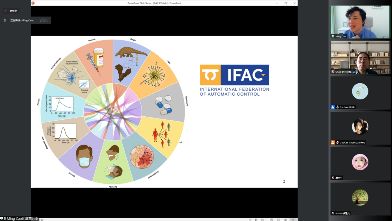 赵宇副教授、东南大学温广辉教授、美国加州大学河滨分校任伟教授、北京大学李忠奎教授共同担任主席,中国电力科学研究院徐式蕴教授、芬兰TC5.4成员Hans AALTO担任副主席。会议特邀香港城市大学陈关荣教授、荷兰格罗宁根大学曹明教授就当前复杂系统控制领域相关问题进行了精彩报告。来自国内外相关领域的专家学者们就各自的研究工作,以线上会议或线上海报张贴的方式进行了广泛而深入的讨论,会场气氛活跃而热烈。