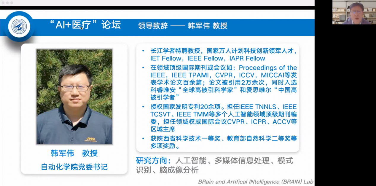 脑与人工智能实验室的渊源,特别强调实验室一直秉持“顶天 立地 育人”的理念,“顶天”即要做国际一流的前沿高水平基础研究,“立地”即要解决实际问题,又要为国家国防做出贡献,“育人”即要培养具有突出创新能力的拔尖人才。韩军伟表示,以“AI+医疗”新星论坛为平台进行学术交流、探讨国际前沿问题,对于贯彻“顶天 立地 育人”理念、鼓励团队创新性研究、推动实验室快速发展、促进青年人才成长等具有重大意义。