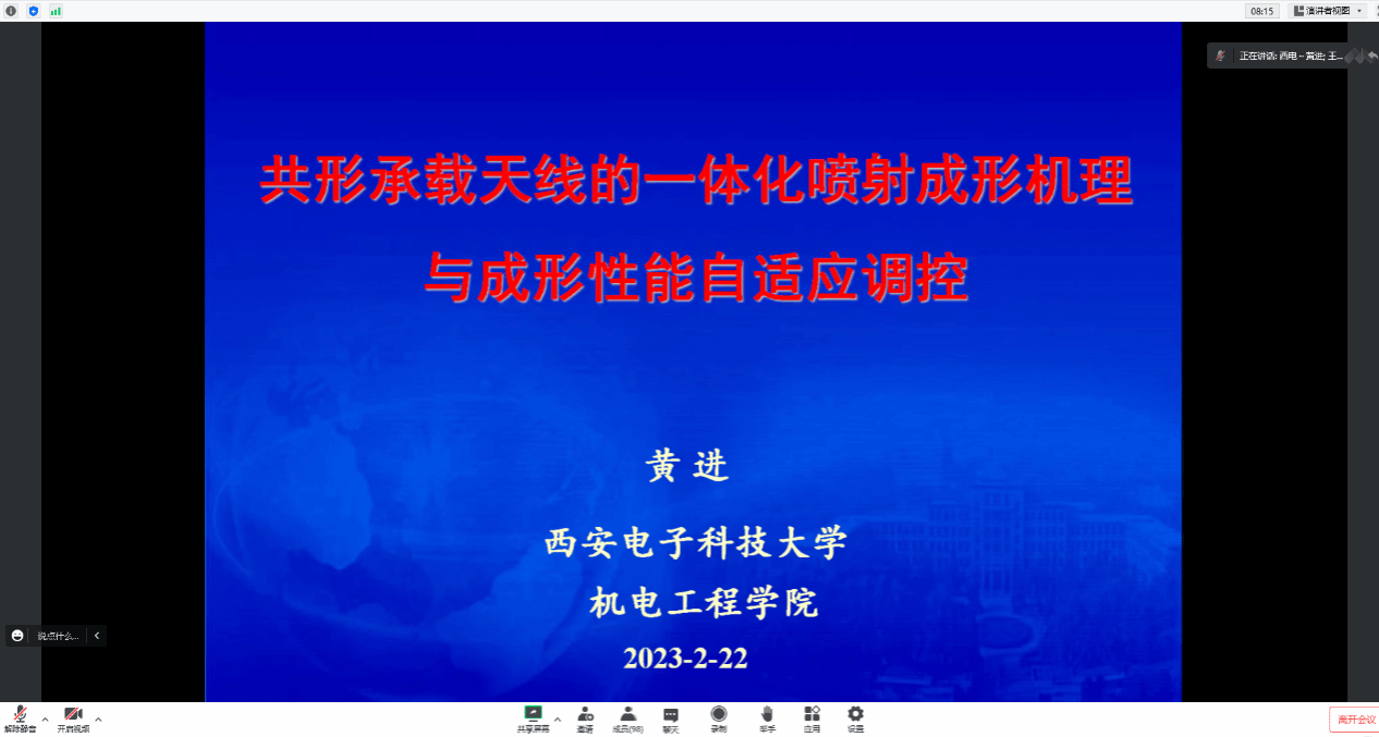 报告会伊始,王小旭教授首先对黄进教授的研究工作及相关履历进行了介绍,并对黄进教授表示热烈欢迎。在本次报告会上,黄进教授首先介绍了一种极具潜力的共形成载天馈系统制造技术——一体化喷射成形与烧结固化技术;其次针对共形承载天线的“微滴喷射”、“光子固化”以及“设备研发”过程中存在的难点问题进行了详细讲解;之后探讨了喷射性能的等效电路分析方法和成形性能预测的多尺度分析方法、面向成形形状的液滴自适应喷射控制和面向成形性能的烧结固化能量闭环反馈控制方法,并结合研制的一体化喷射成形设备及成形的树脂基、陶瓷基共形承载天馈系统,展望了未来的研究和发展趋势。