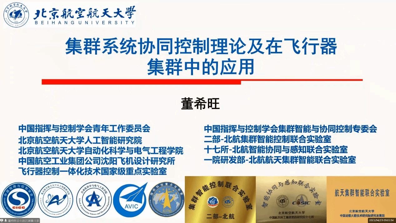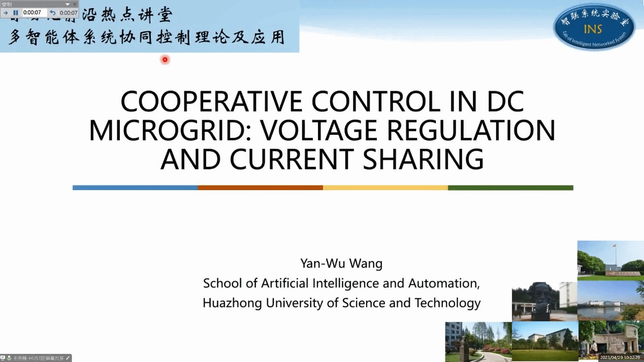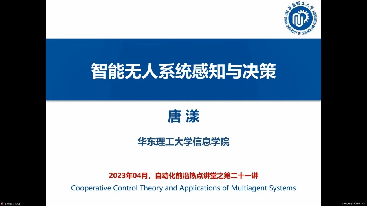 董希旺教授作“集群系统协同控制理论及在飞行器集群中的应用”的学术报告;洪奕光教授作“不完全信息下多智能体系统博弈”的学术报告;王燕舞教授作“直流微网多源协同供电控制”的学术报告;唐漾教授作“智能无人系统感知与决策”的学术报告。