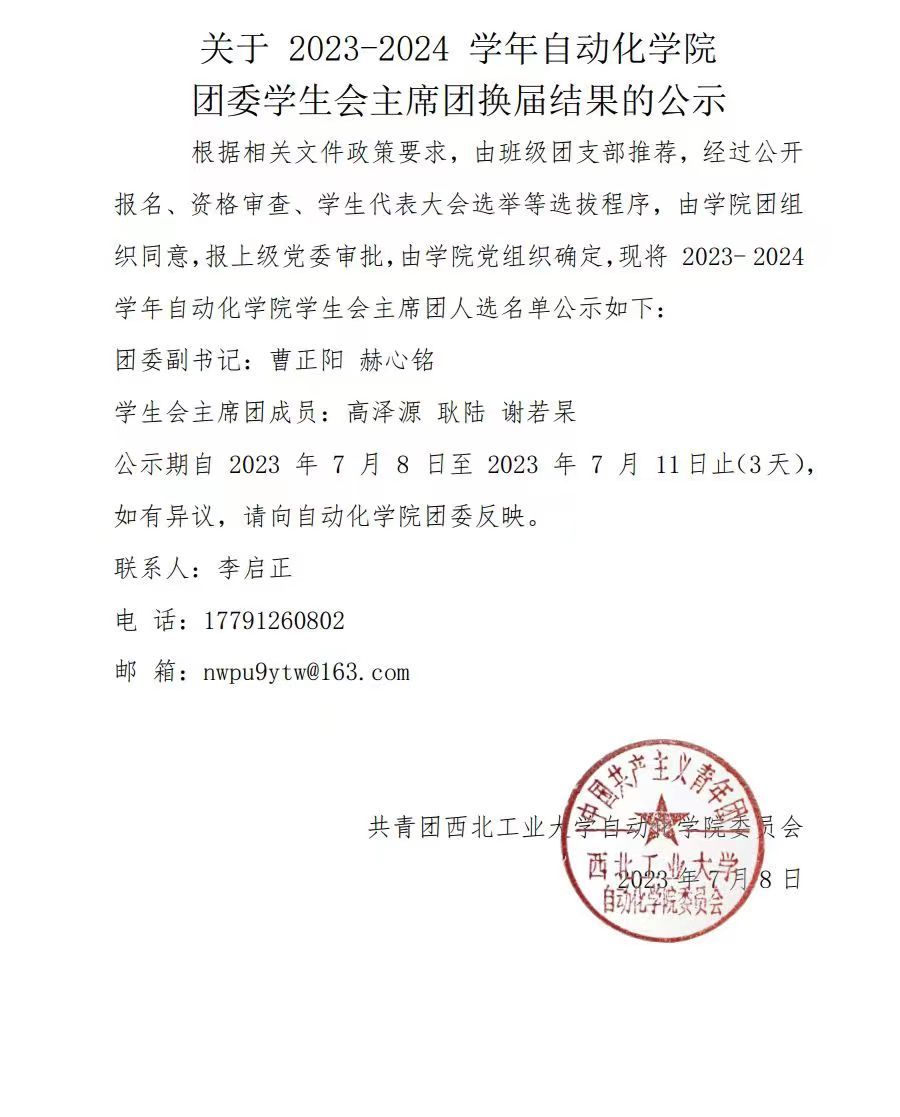 根据相关文件政策要求,由班级团支部推荐,经过公开报名、资格审查、学生代表大会选举等选拔程序,由学院团委组织同意,报上级党委审批,由学院党组织确定,现将 2023- 2024 学年杰克论坛 学生会主席团人选名单公示如下: