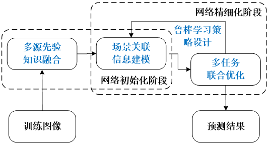 开题报告主要针对弱监督图像理解中不同阶段的问题进行深入研究,提出弱监督图像理解在不同阶段问题的解决方法,具体研究内容如图1所示。针对弱监督图像理解深入探讨的四个阶段包括:多源先验知识融合、场景关联信息建模、多任务联合优化及鲁棒学习策略设计。在弱监督学习过程中,四个阶段彼此之间相互依赖又相互补充。在网络初始化中,通过多源先验知识融合和场景关联信息建模挖掘指导网络参数的训练。在网络精细化中,利用不同任务各自的优势互补学习,促进多任务的图像信息表征和弱监督模型训练。设计鲁棒的学习策略可以减轻学习过程中样本噪声的影响,解决弱监督深度学习过程中固有的不确定性问题。本研究利用卷积神经网络,实现深度神经网络通用架构,提高弱监督图像理解网络的准确性和鲁棒性。