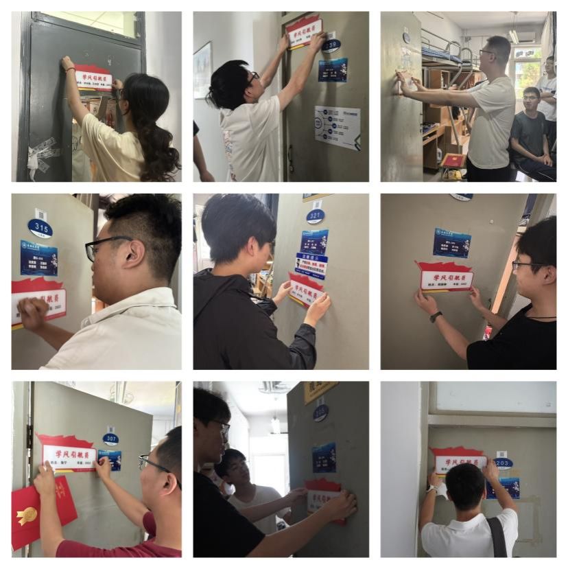 会后,“学风引航员”走进对接帮扶的宿舍,开展挂牌活动。党员们将印有自己姓名和年级的“学风引航员”标牌张贴在宿舍门口,并与宿舍成员进行了深入交流。