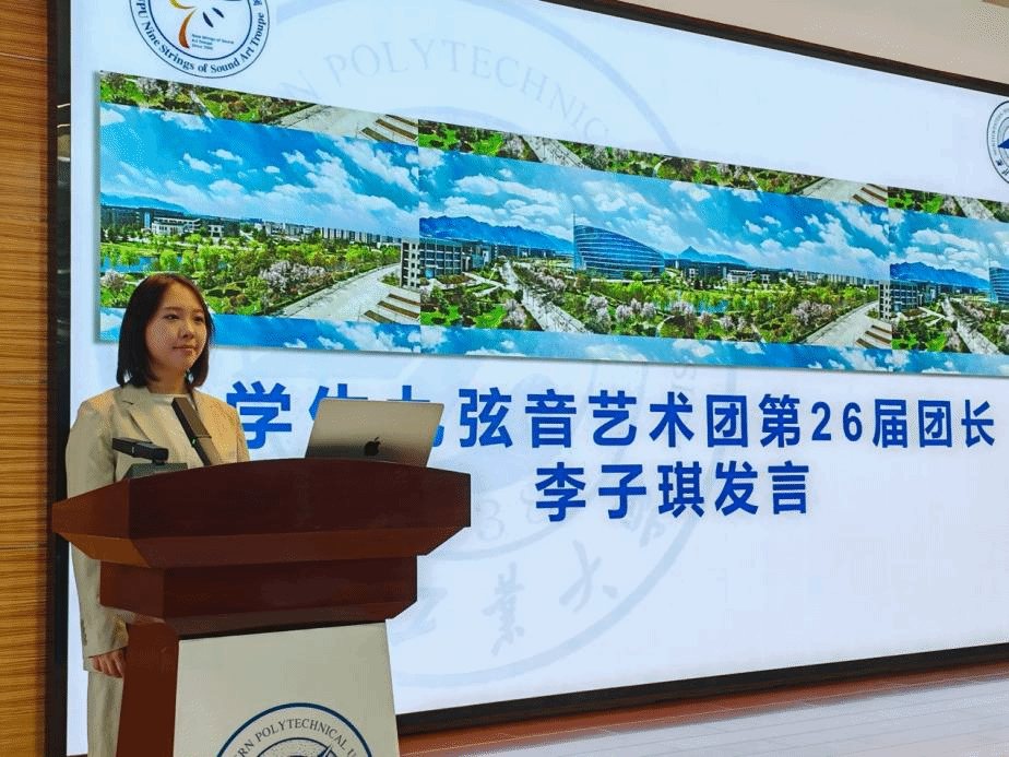 第26届团长李子琪同学系统阐述了工作规划与发展愿景,表示将秉承九弦音“艺术育人、服务校园”的宗旨,推动艺术创作与团队建设协同发展,并希望全体成员以热忱之心共筑艺术梦想。