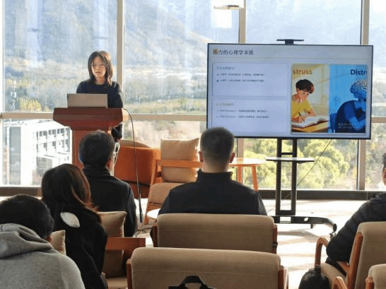 心理委员邢露颖首先通过一个简单的“压力自评测试”小游戏引导大家察觉正视自身压力水平。随后,从心理学角度讲解了压力的来源、表现以及适度的压力对人体的积极作用,重点分享了多种简单易行的压力缓解与情绪调适技巧。